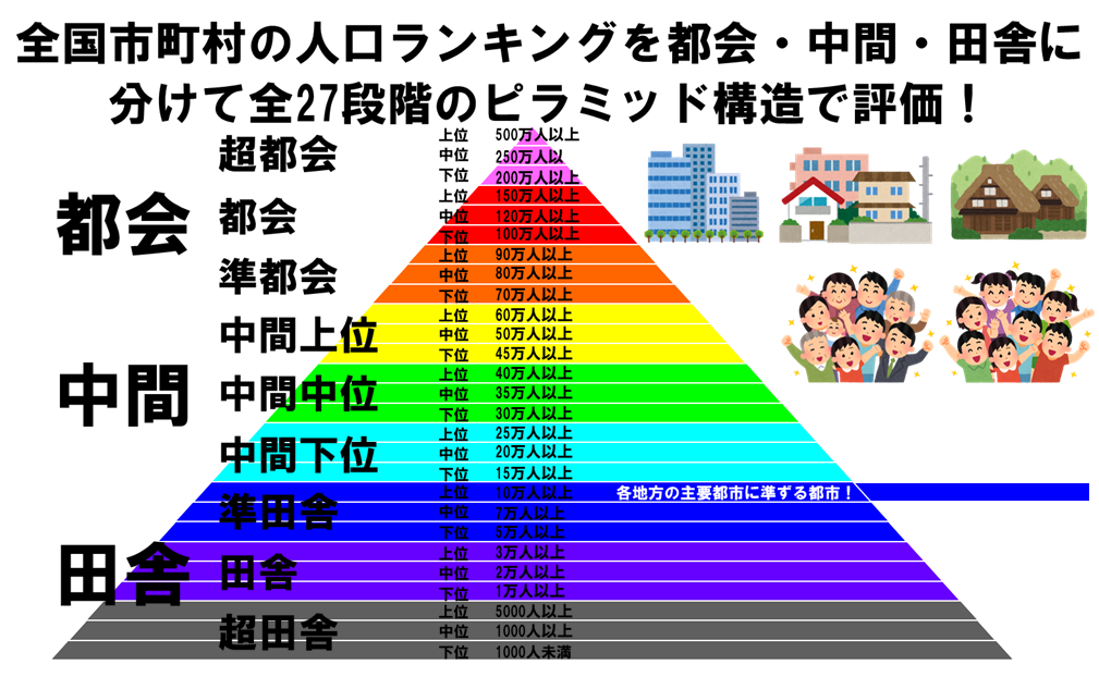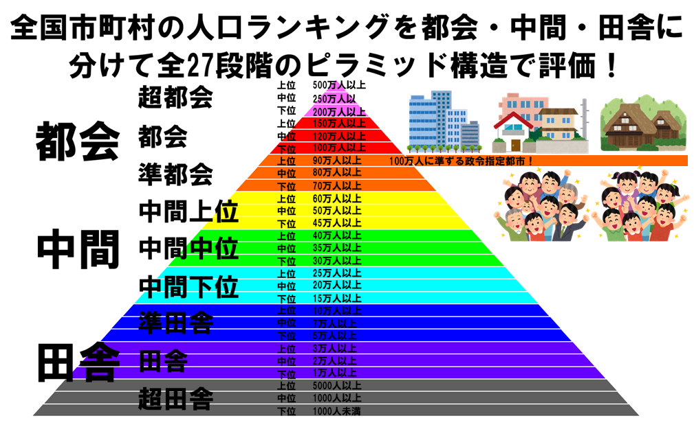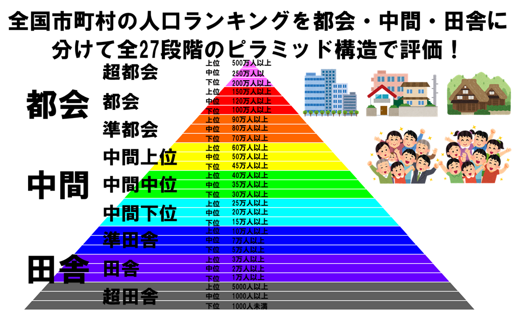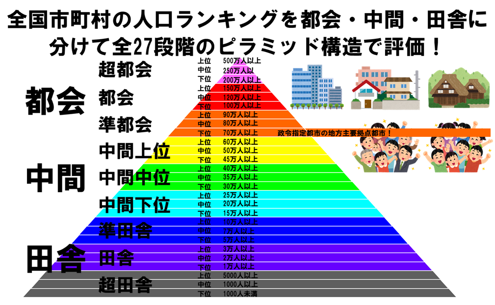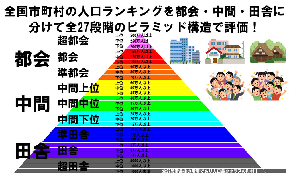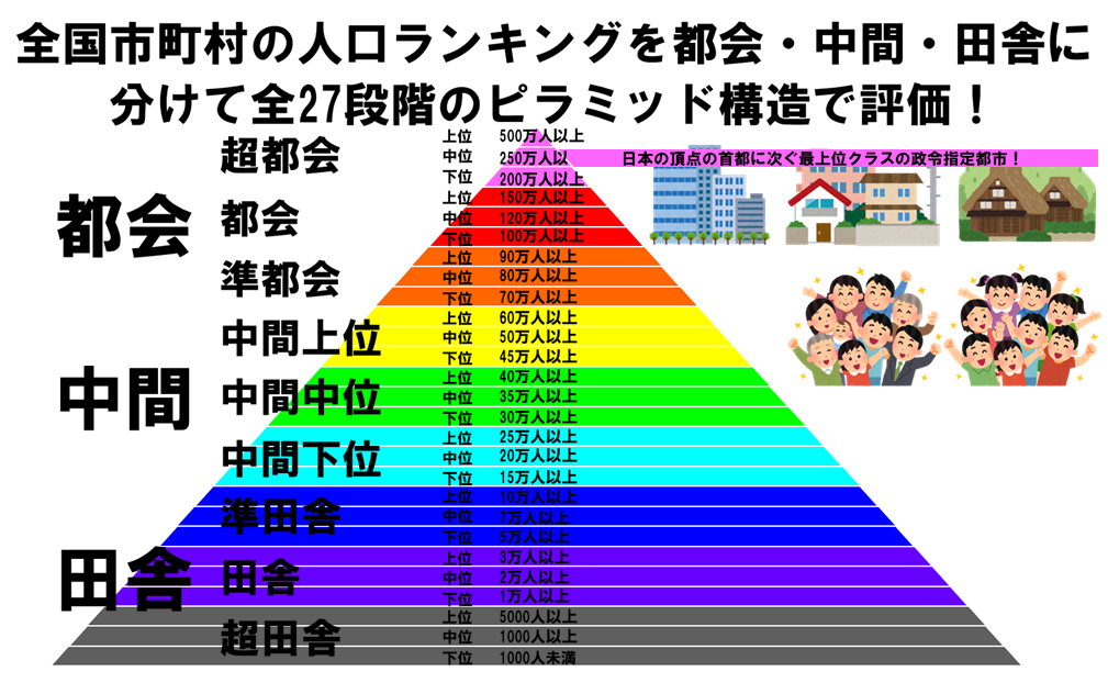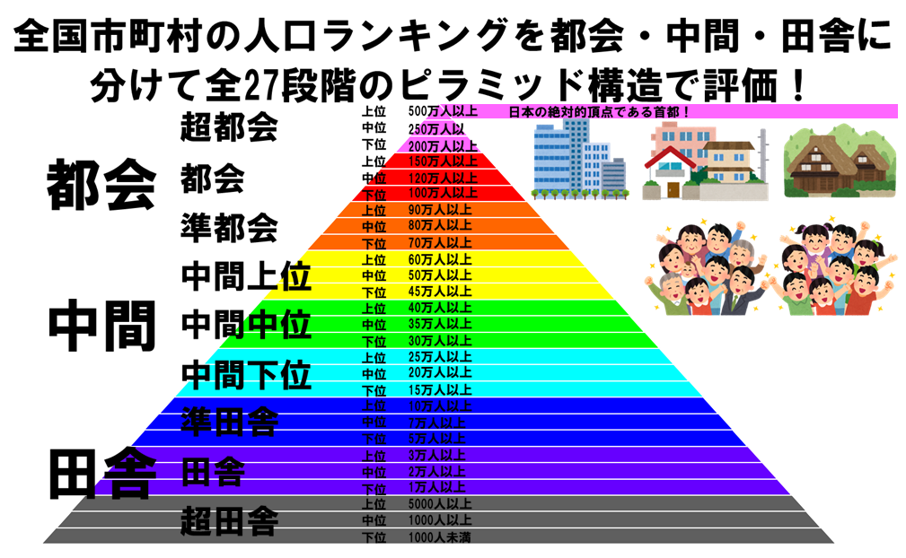 全国市町村の人口ランキングを都会・中間・田舎に分けて全27段階のピラミッド構造で評価!