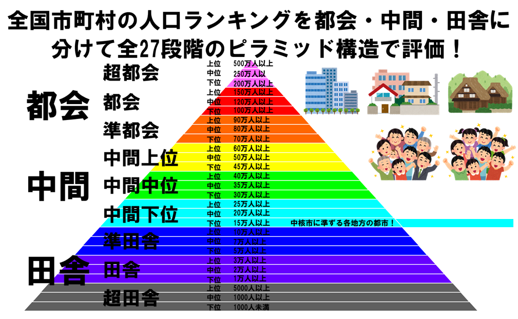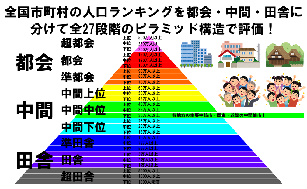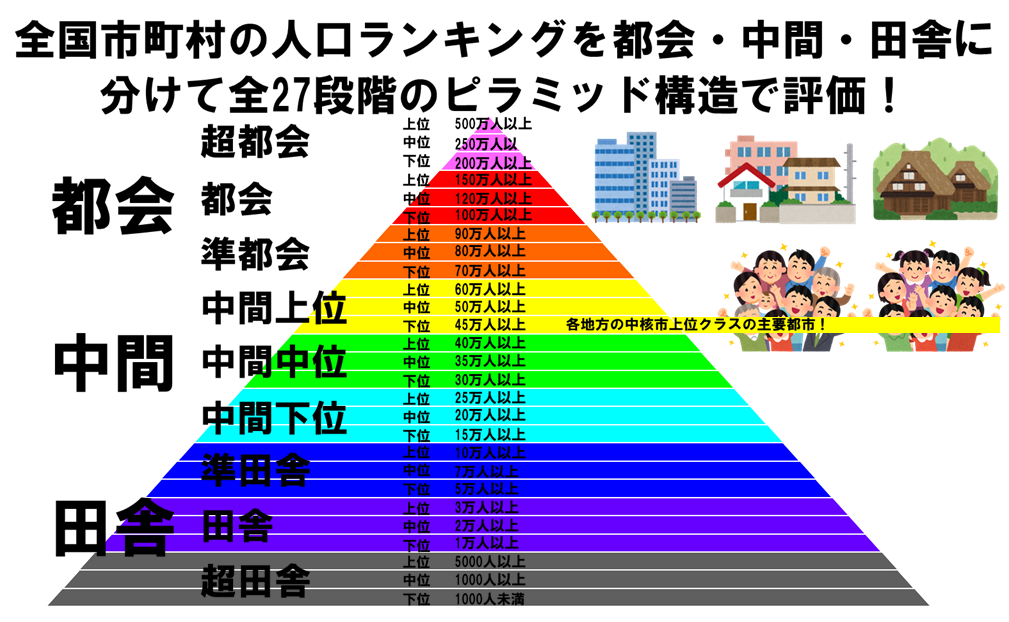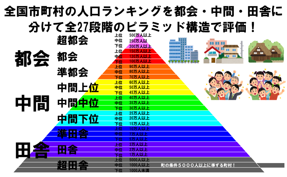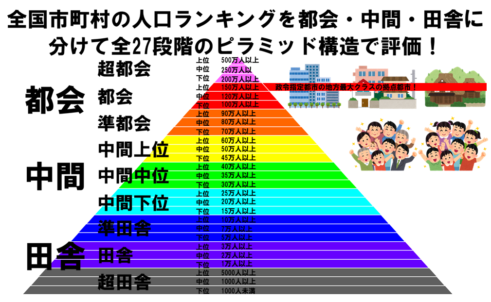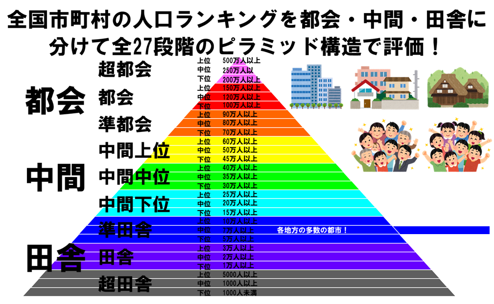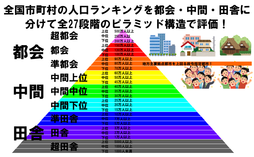 全国市町村の人口ランキングを都会・中間・田舎に分けて全27段階のピラミッド構造で評価!