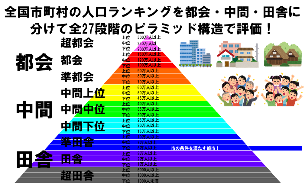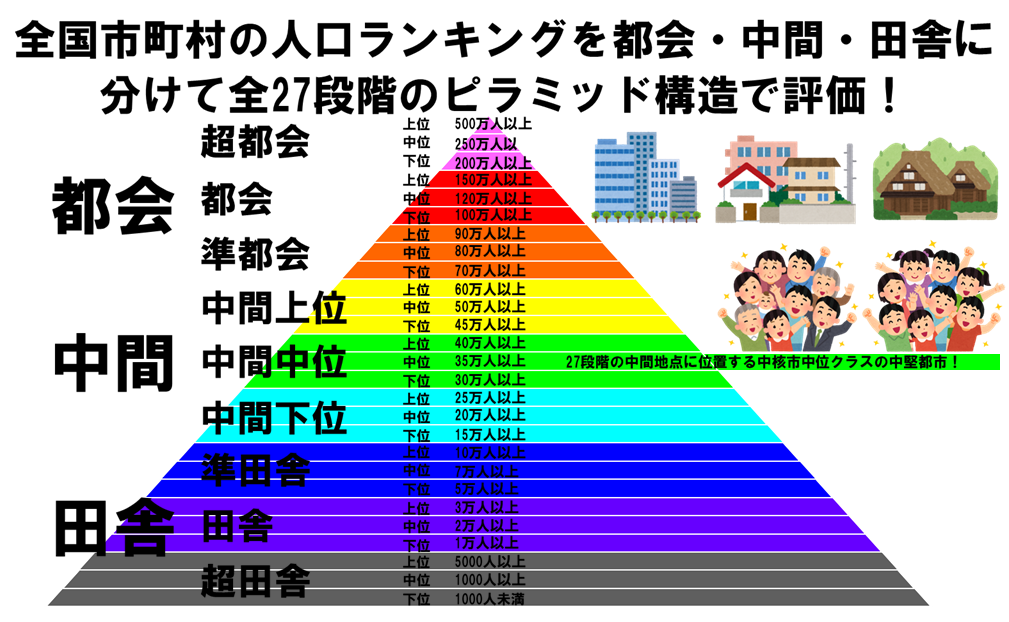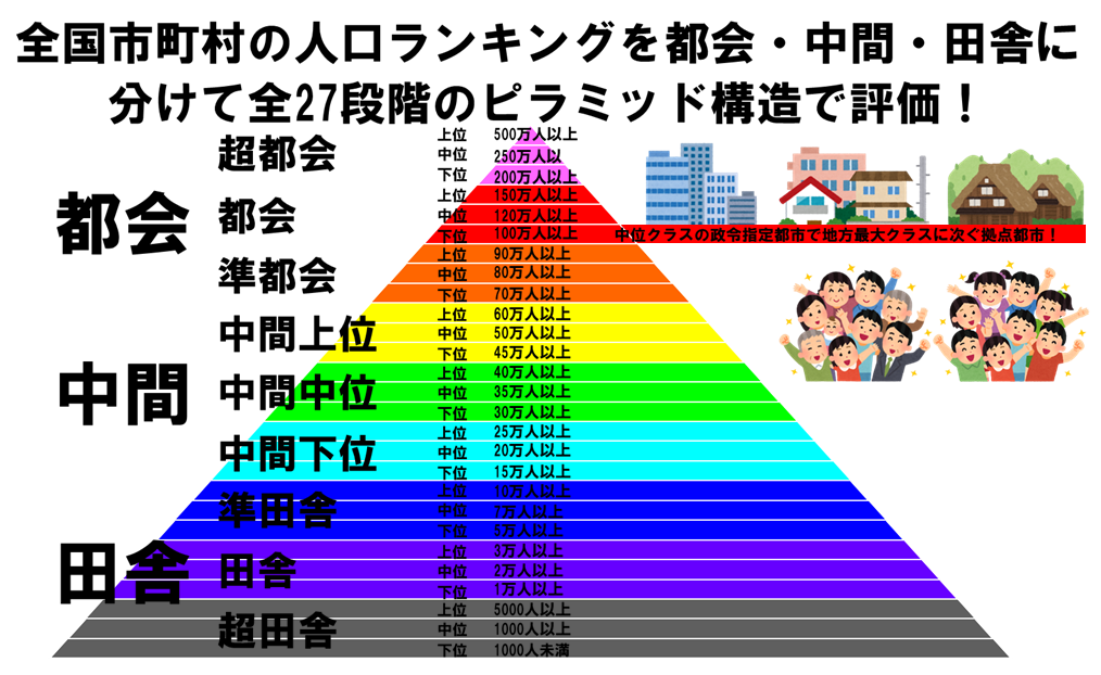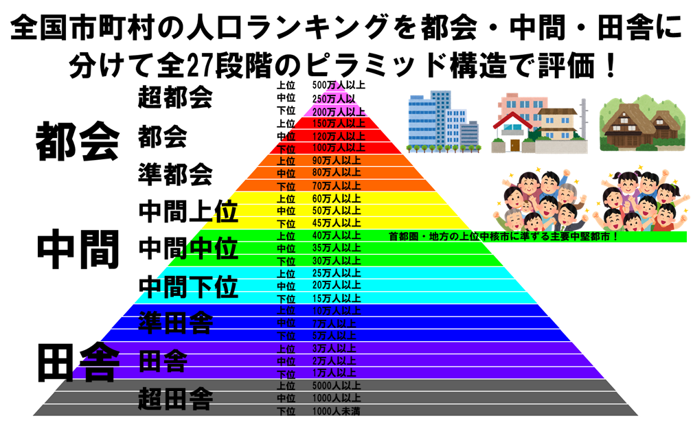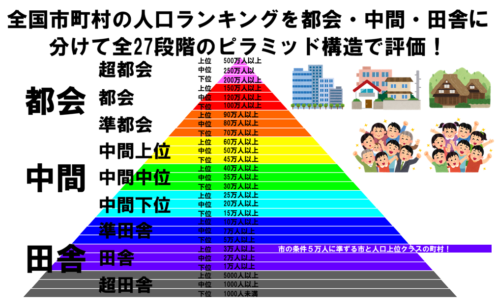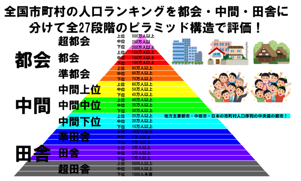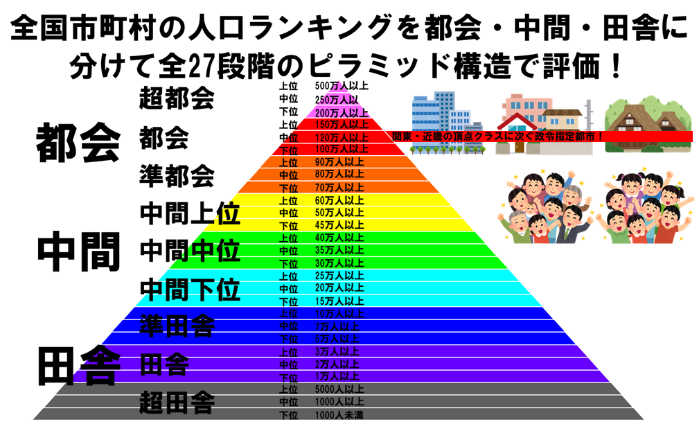 全国市町村の人口ランキングを都会・中間・田舎に分けて全27段階のピラミッド構造で評価!