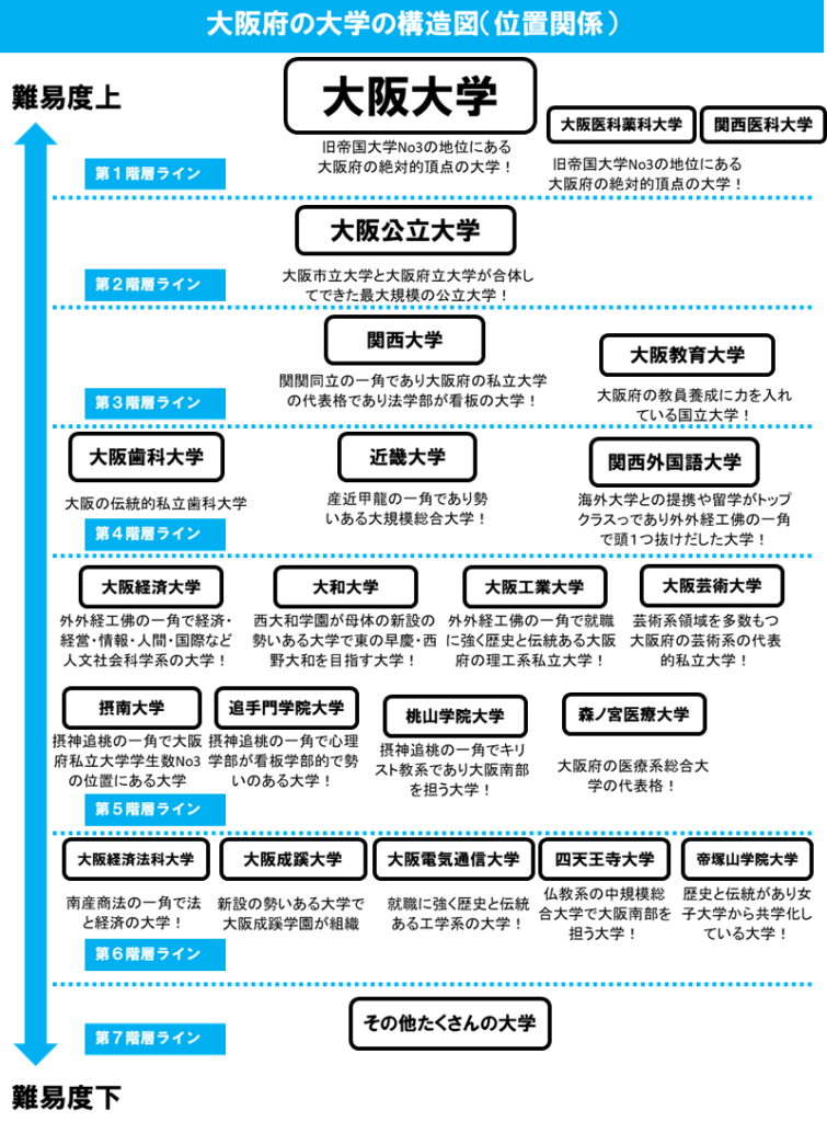 大阪府の大学の序列をもう一度階層別にそれぞれの特徴を述べていきます。
